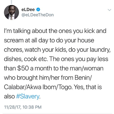 Already you know the matter at hand is about the slavery of some Africans in Libya at the moment. So many celebrities and individuals have lend their voices towards it. But Eldee not supporting it too however feels we should start from our homes. Do you have an underage doing your house chores from morning to night? Watching over your kids? Do you pay his/her parents/guardian/uncle/aunty monthly? Then you are also guilty according to Eldee. The singer says, it's not employment nor trying to make the lives of the children better, but slavery. His tweets after the cut.