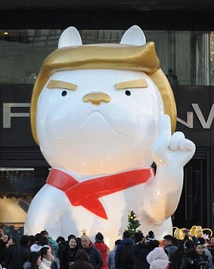 The huge canine figure has Trump's, 71, signature golden hairstyle, prominent eyebrows and classic gesture.